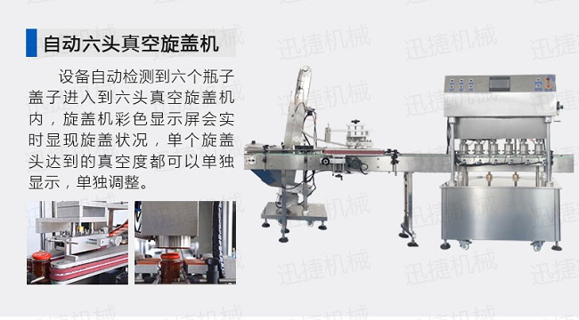 該直線式真空旋蓋機是結合用戶使用的情況,摒棄了傳統轉盤式真空旋蓋機的弊端,研制開發的設備,設備自動檢測到六個瓶子蓋子進入到六頭真空旋蓋機內,旋蓋機彩色顯示屏會實時顯現旋蓋狀況,整機多點檢測,當進口無瓶無蓋、出口堵塞、定位不準、瓶身傾倒均自動停機。單個旋蓋頭達到的真空度都可以單獨顯示,單獨調整!