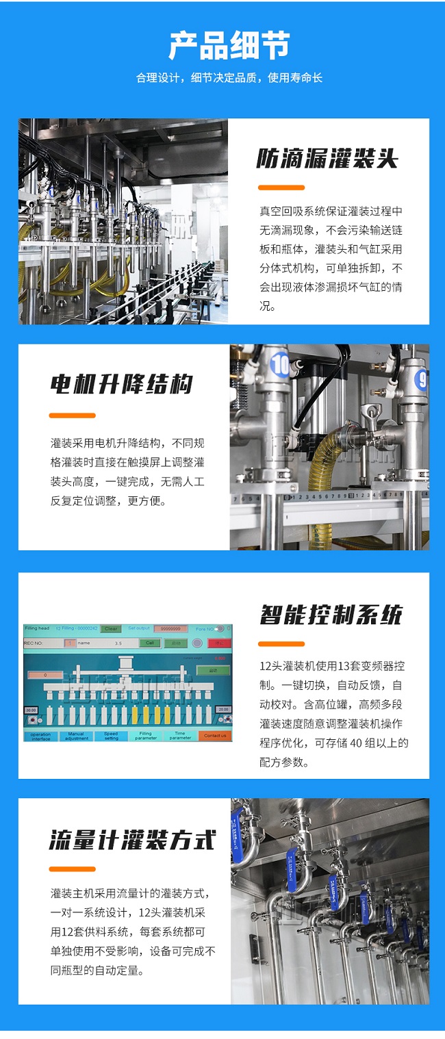 機器應用范圍:1-10升通用型號,機器采用流量計計量,觸摸屏控制,參數一鍵調整,方便快捷。可以灌裝各種油脂,油料。灌裝頭采用專用的油脂防滴漏灌裝頭,不滴漏。機器設定有快慢速技術,可以先快后慢,防止物料噴濺。保持生產車間干凈潔凈。