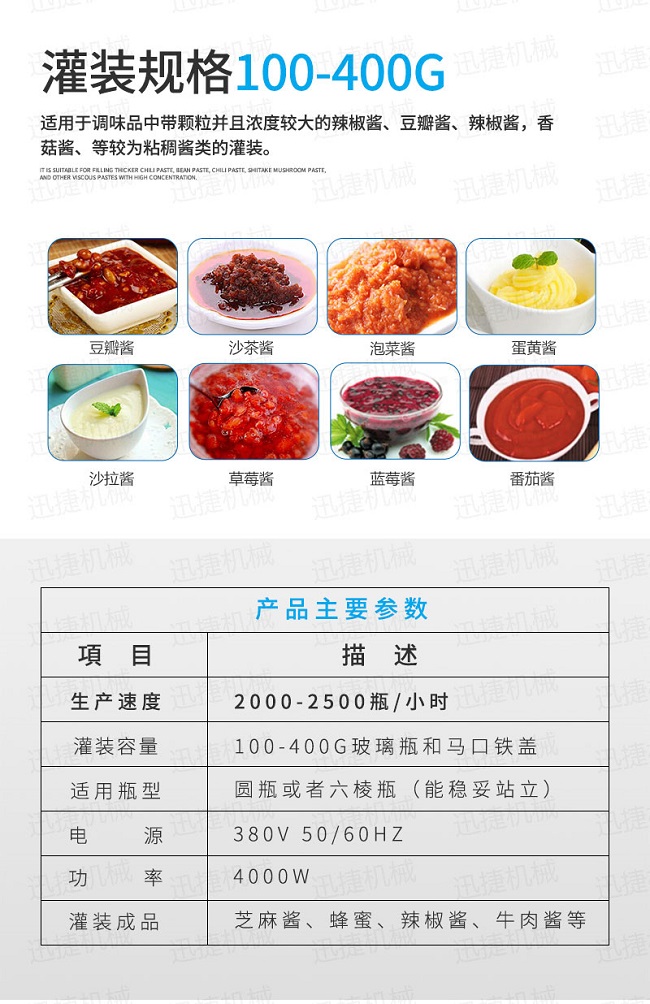 灌裝機采用活塞式灌裝原理,適用于調味品中帶顆粒并且濃度較大的辣椒醬、豆瓣醬、花生醬、香菇醬、果醬、牛油火鍋底料、紅油火鍋底料、蝦醬等較為粘稠醬類的灌裝。
